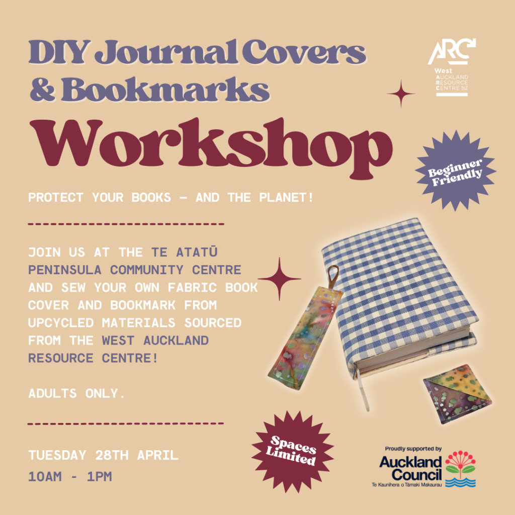Join us at the the Te Atatū Peninsula Community Hub and learn to sew your very own Fabric book cover and bookmark from upcycled materials sourced from the West Auckland Resource Centre!