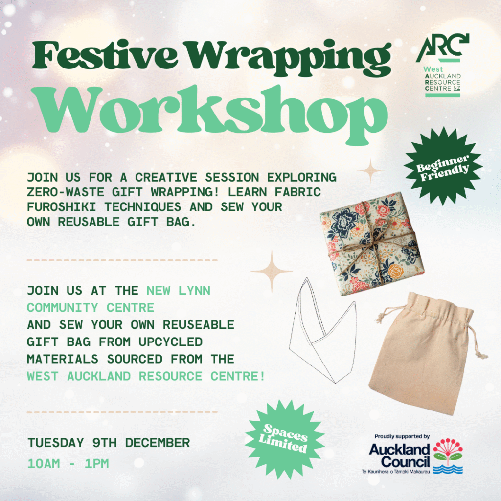 Join us at the New Lynn Community Centre and sew your own reuseable gift bag from upcycled materials sourced from the West Auckland Resource Centre!