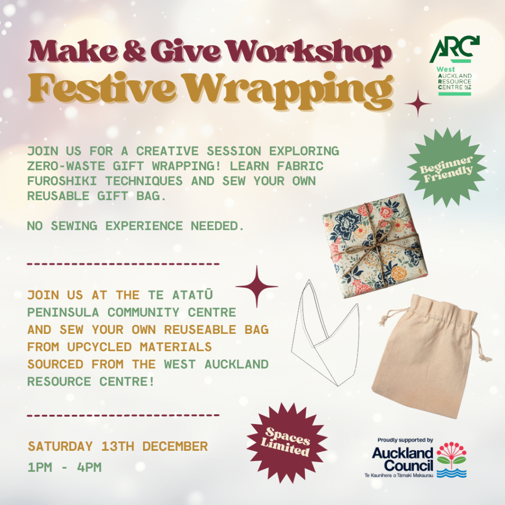 Beginner friendly and no sewing experience required. We’ll provide all the upcycled materials you need, thanks to the West Auckland Resource Centre.